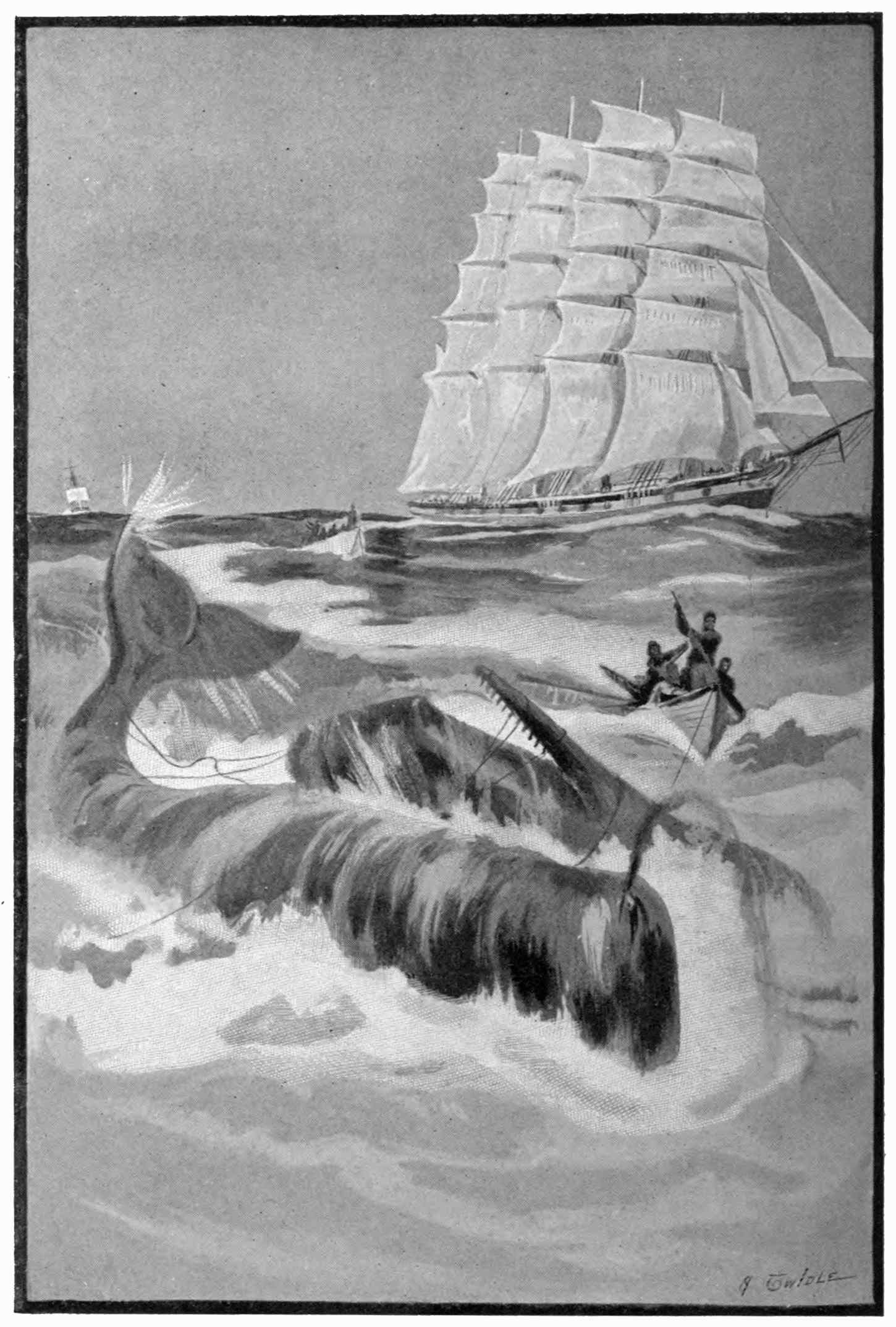 More than an hour passed thus tantalizingly on board the Mirzapore, and even the most eager watchers had tired of their fruitless gazing over the sea and at the sphinx-like old ship so near them. Then some one suddenly raised a shout, “Here they come!” It was time. They were coming—a-zoonin’, as Uncle Remus would say. It was a sight to fire the most sluggish blood. About five hundred yards apart two massive bodies occasionally broke the bright surface up into a welter of white, then disappeared for two or three minutes, to reappear at the same furious rush. Behind each of them, spreading out about twenty fathoms apart, came two of the boats, leaping like dolphins from crest to crest of the big waves, and occasionally hidden altogether by a curtain of spray. Thus they passed the Mirzapore, their gigantic steeds6 in full view of that awe-stricken ship’s company, privileged for once in their lives to see at close quarters one of the most heart-lifting sights under heaven—the Yankee whale-fisher at hand-grips with the mightiest, as well as one of the fiercest, of all created things. No one spoke as that great chase swept by, but every face told eloquently of the pent-up emotion within.