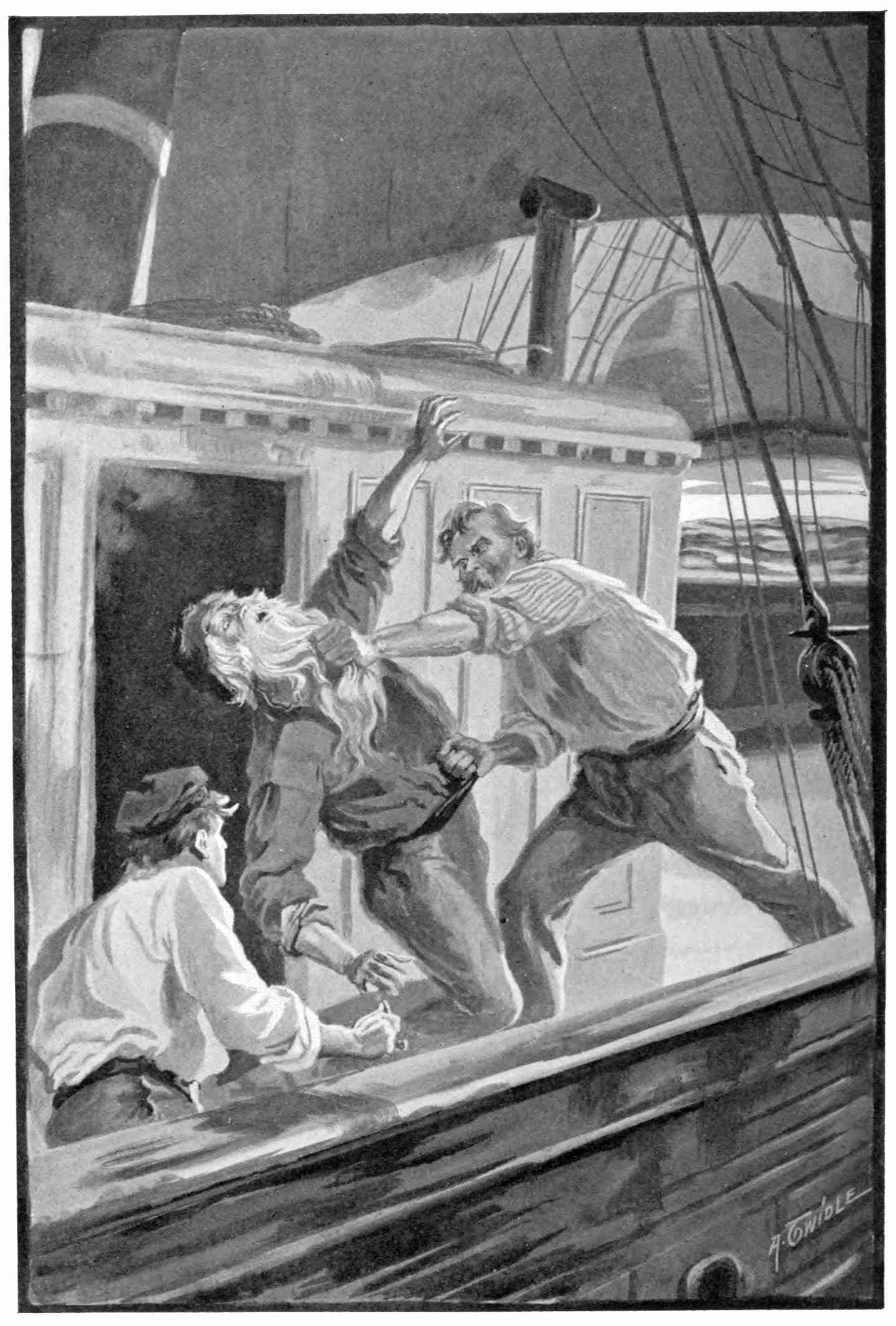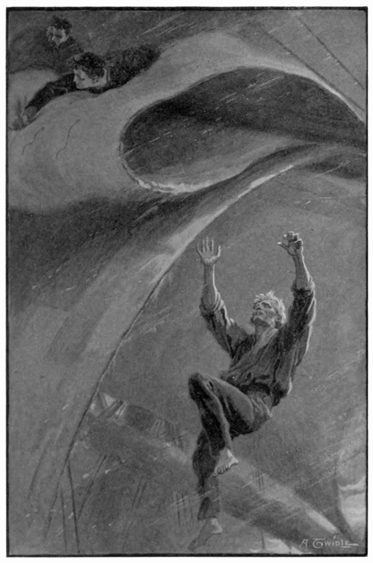 Night fell, shutting out from the gaze of those wearied watchers the dumpy outlines of the old whale-ship. Her crew were still toiling, a blazing basket of whale-scrap swinging at a davit and making a lurid smear on the gloomy background of the night. One9 by one the excited passengers sauntered below, still eagerly discussing the stirring events they had witnessed, and making a thousand fantastic additions to the facts. Gradually the conversation dwindled to a close, and the great ship was left to the watch on deck. Fitful airs rose and fell, sharp little breaths of keen-edged wind that but just lifted the huge sails lazily, and let them slat against the masts again as if in disgust at the inadequacy of cat’s-paws. So the night wore on, till the middle watch had been in charge about half an hour. Then, with a vengeful hiss, the treacherous wind burst upon them from the north-east, catching that enormous sail-area on the fore side, and defying the efforts of the scanty crew to reduce it. All hands were called, and manfully did they respond; Briton and Finn, German and negro toiled side by side in the almost impossible effort to shorten down, while the huge hull, driven stern foremost, told in unmistakable sea-language of the peril she was in. Hideous was the uproar of snapping, running gear, rending canvas, breaking spars, and howling wind; while through it all, like a thread of human life, ran the wailing minor of the seamen’s cries as they strove to do what was required of them.