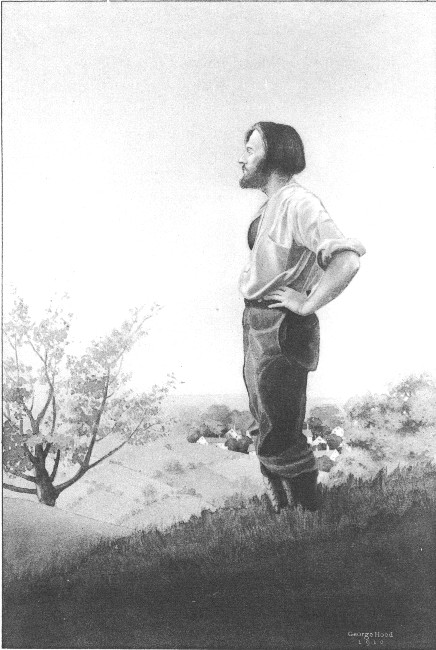 The man idling beside this magnificent equipage was the most picturesque being I have ever seen. He was of medium height with broad, muscular shoulders, sturdy legs like one used to walking much in the open, and a general ease and grace of movement, as if each motion were made to music, indicating a perfect health of body. His features were large and generous with penetrating quizzical gray eyes, a nose slightly Roman, and a wide mouth which seemed continuously to be struggling to suppress a smile. He wore a short bushy beard that needed brushing. His hair was red, heavy, unkempt, and a trifle long, completely[Pg 5] covering his ears. On his feet were stout, heavy-soled, laced boots. Thrust into their tops were well-worn corduroy trousers. His shirt was of dark blue woolen material, open at the neck, showing a corded, hairy chest. He wore no hat.