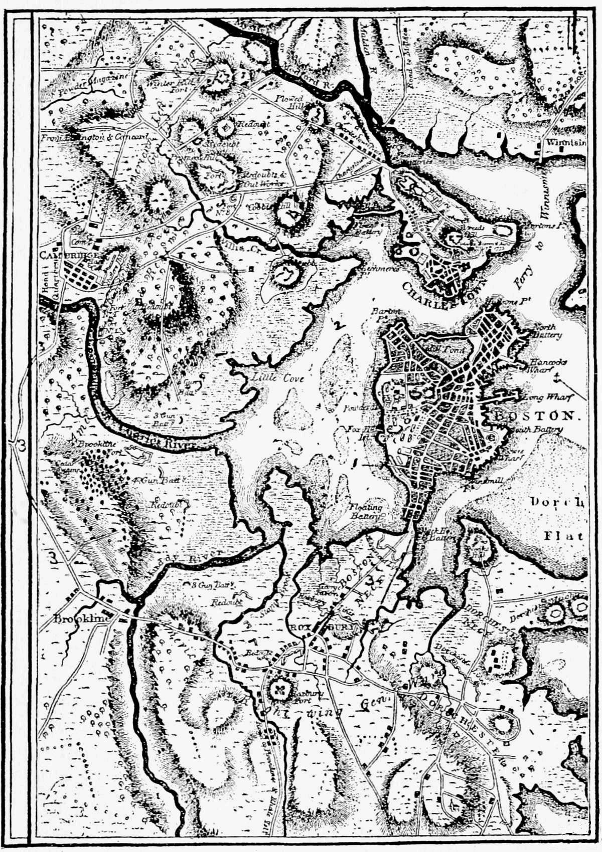 In 1775 the greater part of the present town of Arlington was a part of Cambridge, and known[vii] as the Menotomy Precinct. Later it was incorporated as a separate town and called West Cambridge. Later still its name was changed to Arlington. Somerville, in that year, was a part of Charlestown. What remained of Charlestown eventually became a part of Boston, though still retaining its ancient name. In writing of the events that happened within the boundaries of each, I shall speak of them as of Arlington, of Somerville, and of Charlestown.