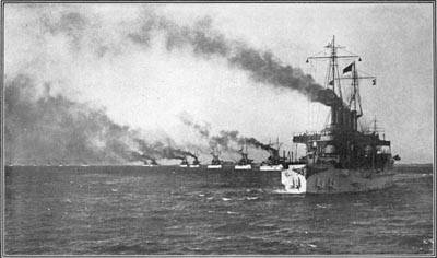 In single file for two hours the ships kept on their course. They were like so many Indians on a jaunt. Each ship stood for sovereignty. Each stood for brute strength.[8] Each stood for the development of science and skill. Each stood for an impressive expression of patriotism. In that fleet of sixteen ships there seemed to be concentrated, according to some of those who looked at them, the entire power of the United States for good or evil.
