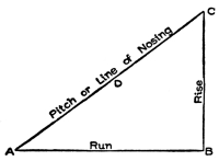The term rise and run is often used, and indicates certain dimensions of the stairway. Fig. 1 will illustrate exactly what is meant; the line A B shows the run, or the length over the floor the stairs will occupy. From B to C is the rise, or the total height from top of lower floor to top of upper floor.[A] The line D is the pitch or line of nosings, showing the angle of inclination of the stairs. On the three lines shown—the run, the rise, and the pitch—depends the whole system of stair-building.