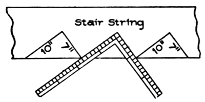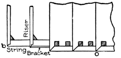 Fig. 10 is a plan of the portion of a stairway shown in Fig. 9. Here the position of the string, bracket, riser, and tread can be seen. At the lower step is shown how to miter the riser to the string; and at the second step is shown how to miter it to the bracket.
