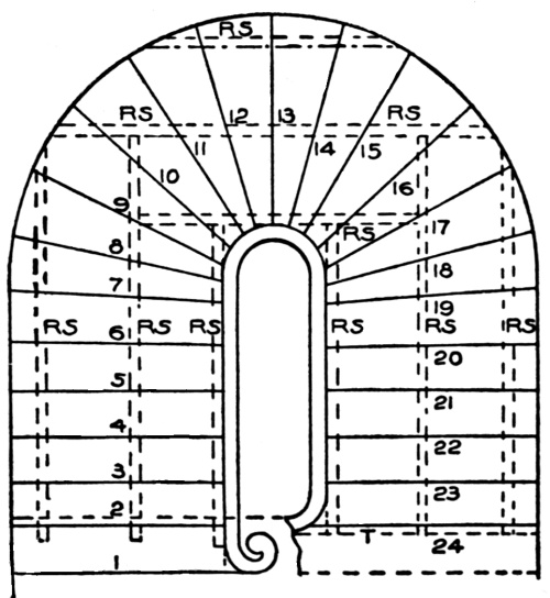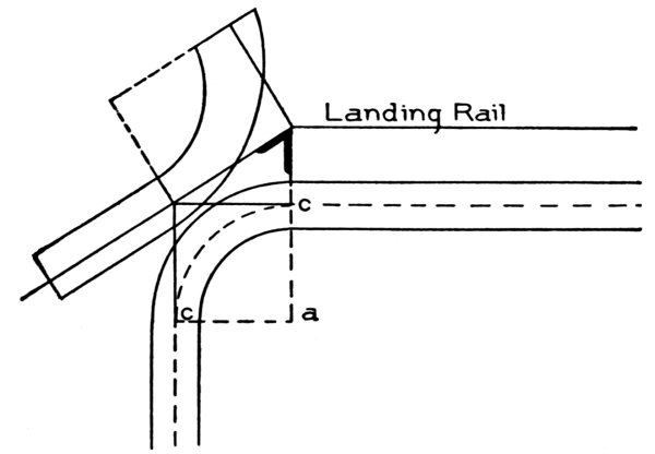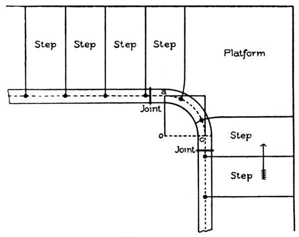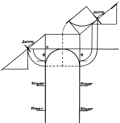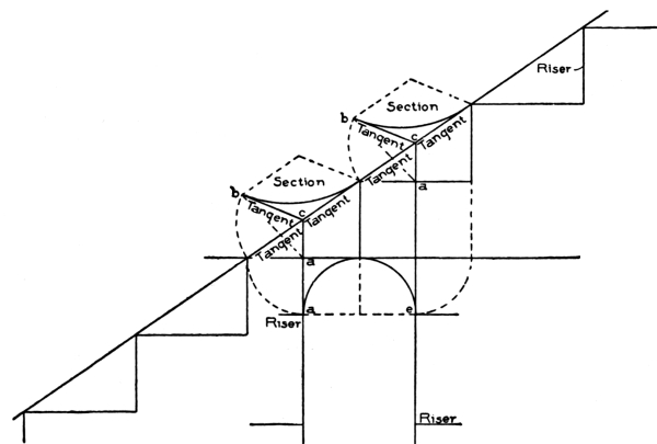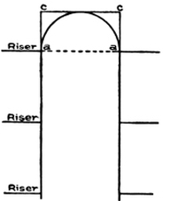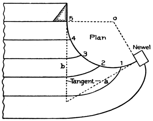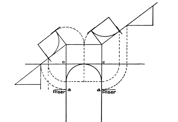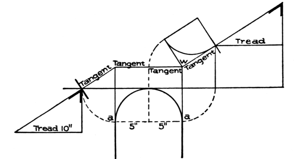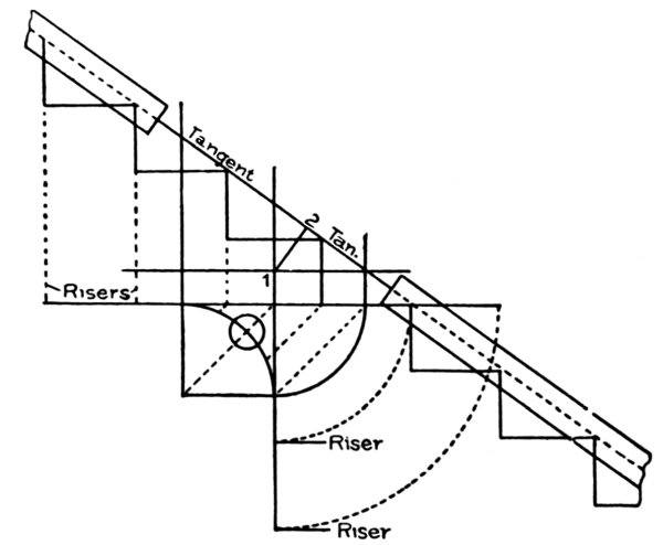 Stairways should be commodious to ascend—inviting people, as it were, to go up. When winders are used, they should extend past the spring line of the cylinder, so as to give proper width at the narrow end (see Fig. 72) and bring the rail there as nearly as possible to the same pitch or slant as the rail over the square steps. When the hall is of sufficient width, the stairway should not be less than four feet wide, so that two people can conveniently pass each other thereon. The height of riser and width of tread are governed by the staircase, which is the space allowed for the stairway; but, as a general rule, the tread should not be less than nine inches wide, and the riser should not be over eight inches high. Seven-inch riser[Pg 2] and eleven-inch tread will make an easy stepping stairway. If you increase the width of the tread, you must reduce the height of the riser. The tread and riser together should not be over eighteen inches, and not less than seventeen inches. These dimensions, however, cannot always be adhered to, as conditions will often compel a deviation from the rule; for instance, in large buildings, such as hotels, railway depots, or other public buildings, treads are often made 18 inches wide, having risers of from 2½ inches to 5 inches depth.