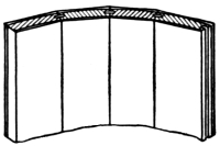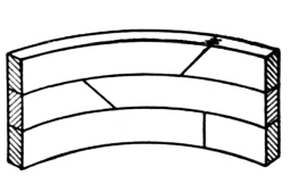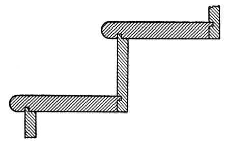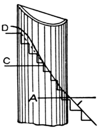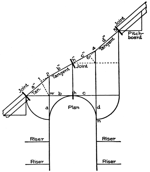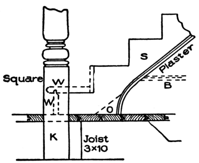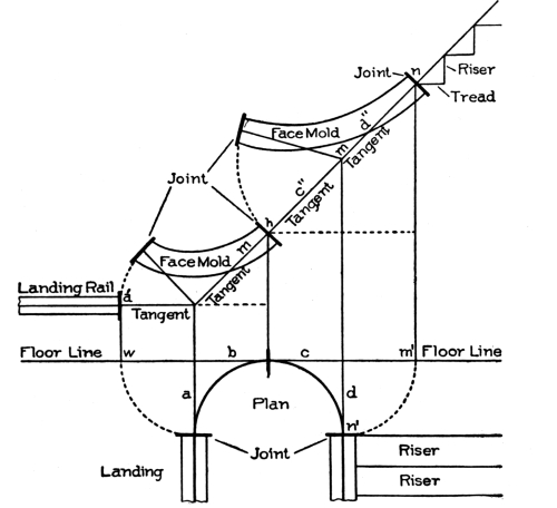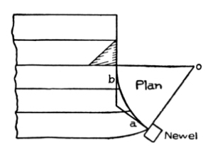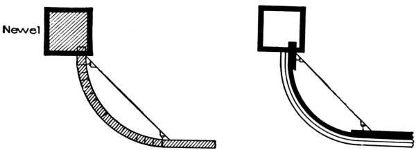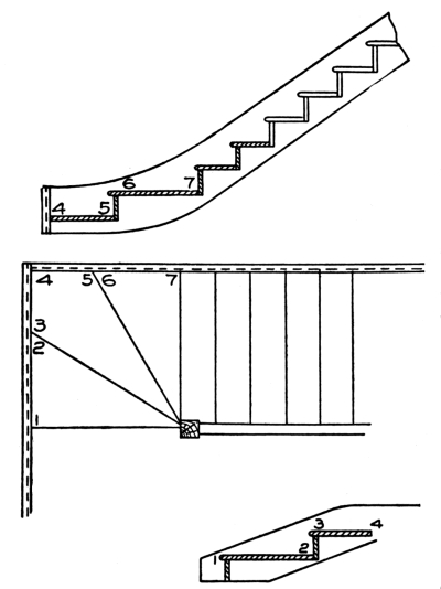 [Pg 8] Staved strings are built up strings, and are composed of narrow pieces glued, nailed, or bolted together so as to form a portion of a cylinder. These are sometimes used for circular stairs, though in ordinary practice the circular part of a string is a part of the main string bent around a cylinder to give it the right curve.