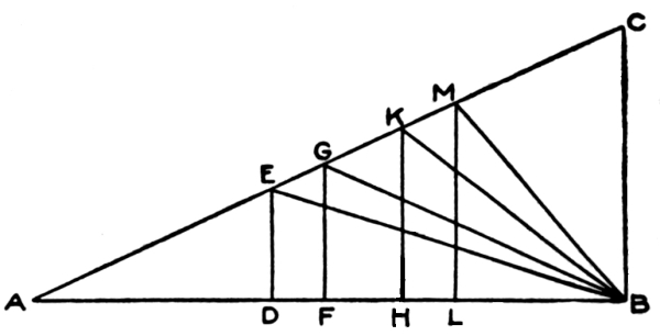 Having determined the width of treads and risers, a pitch-board should be formed, showing the angle of inclination. This is done by cutting a piece of thin board or metal in the shape of a right-angled triangle, with its base exactly equal to the run of the step, and its perpendicular equal to the height of the riser. It is a general maxim, that the greater the breadth of a step or tread, the less should be the height of the riser; and, conversely, the less the breadth of a step, the greater should be the height of the riser. The proper relative dimensions of treads and risers may be illustrated graphically, as in Fig. 12.