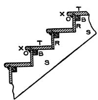 [Pg 4] Fig. 2 shows the manner in which most stair-builders put their risers and treads together. T and T show the treads; R and R, the risers; S and S, the string; O and O, the cove mouldings under the nosings X and X. B and B show the blocks that hold the treads and risers together; these blocks should be from 4 to 6 inches long, and made of very dry wood; their section may be from 1 to 2 inches square. On a tread 3 feet long, three of these blocks should be used at about equal distances apart, putting the two outside ones about 6 inches from the strings. They are glued up tight into the angle. First warm the blocks; next coat two adjoining sides with good, strong glue; then put them in position, and nail them firmly to both tread and riser. It will be noticed that the riser has a lip on the upper edge, which enters into a groove in the tread. This lip is generally about ⅜-inch long, and may be ⅜-inch or ½-inch in thickness. Care must be taken in getting out the risers, that they shall not be made too narrow, as allowance must be made for the lip.