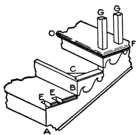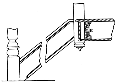 Fig. 8 shows a portion of a cut and mitered string, which will give an excellent idea of the method of construction. The letter O shows the nosing, F the return nosing with a bracket terminating against it. These brackets are about 5⁄16-inch thick, and are planted (nailed) on the string; the brackets miter with the ends of the risers; the ends of the brackets which miter with the risers, are[Pg 6] to be the same height as the riser. The lower ends of two balusters are shown at G G; and the dovetails or mortises to receive these are shown at E E. Generally two balusters are placed on each tread, as shown; but there are sometimes instances in which three are used, while in others only one baluster is made use of.