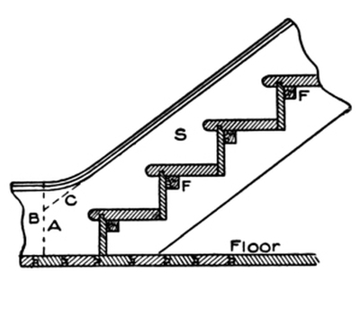 Wall strings are the supporters of the ends of the treads and risers that are against the wall; these strings may be at both ends of the treads and risers, or they may be at one end only. They may be housed (grooved) or left solid. When housed, the treads and risers are keyed into them, and glued and blocked. When left solid, they have a rough string or carriage spiked or screwed to them, to lend additional support to the ends of risers and treads. Stairs made after this fashion are generally of a rough, strong kind, and are especially adapted for use in factories, shops, and warehouses, where strength and rigidity are of more importance than mere external appearance.