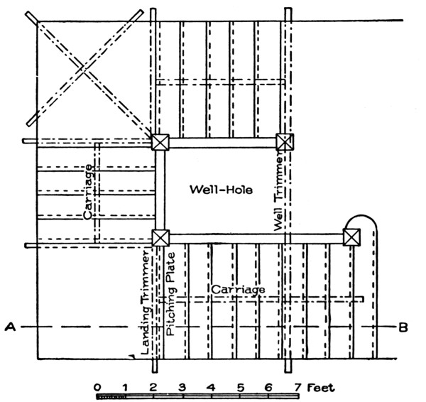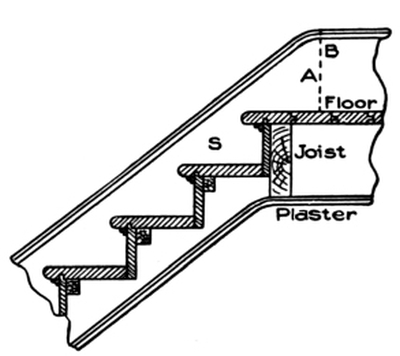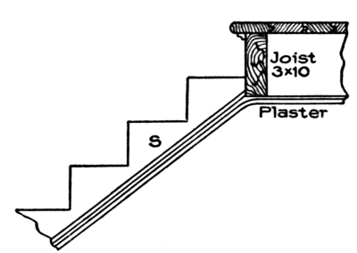 Sometimes stairways are left open on both sides, a practice not [Pg 3] uncommon in hotels, public halls, and steamships. When such stairs are employed, the openings in the upper floor should be well trimmed with joists or beams somewhat stronger than the ordinary joists used in the same floor, as will be explained further on.
