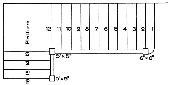 Suppose there are fifteen treads, each being 11 inches wide; this would make a run of 15 × 11 = 165 inches = 13 feet 9 inches. Sometimes this distance is called the going of the stair; this, however, is an English term, seldom used in America, and when used, refers as frequently to the length of the single tread as it does to the run of the stairway.