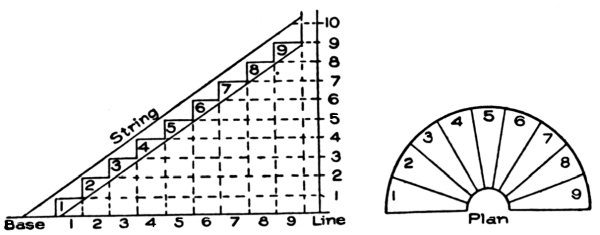 The story rod is simply a dressed or planed pole, cut to a length exactly corresponding to the height from the top of the lower floor to the top of the next floor. Let us suppose this height to be 11 feet 1 inch, or 133 inches. Now, we have 19 risers to place in this space, to enable us to get upstairs; therefore, if we divide 133 by 19, we get 7 without any remainder. Seven inches will therefore be the[Pg 9] width or height of the riser. Without figuring this out, the workman may find the exact width of the riser by dividing his story rod, by means of pointers, into 19 equal parts, any one part being the proper width. It may be well, at this point, to remember that the first riser must always be narrower than the others, because the thickness of the first tread must be taken off.
