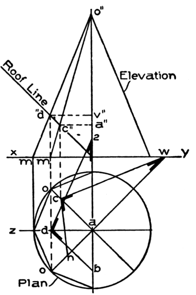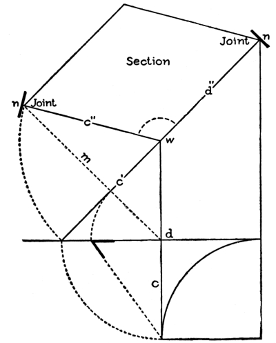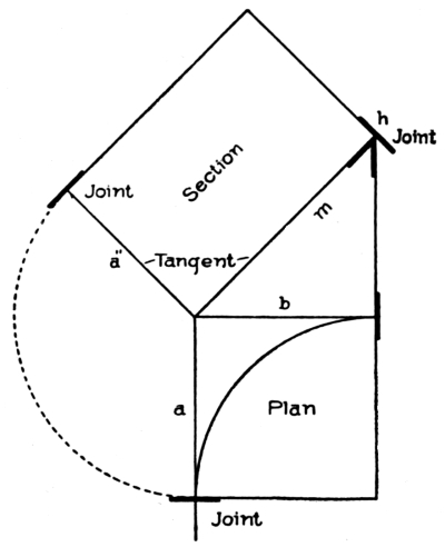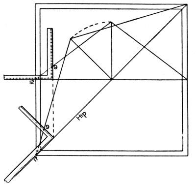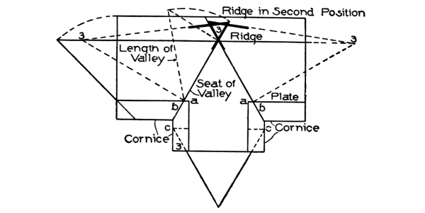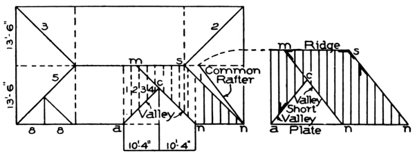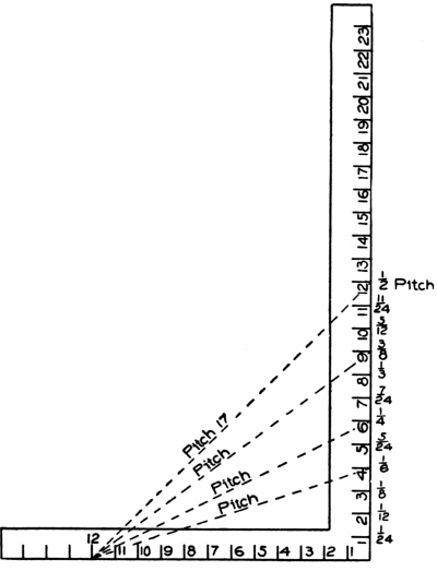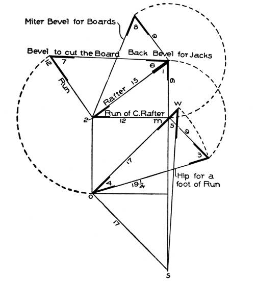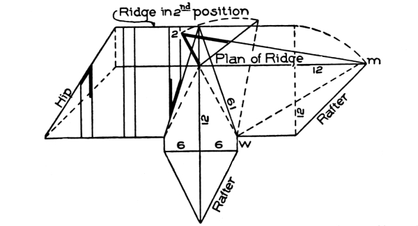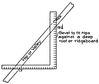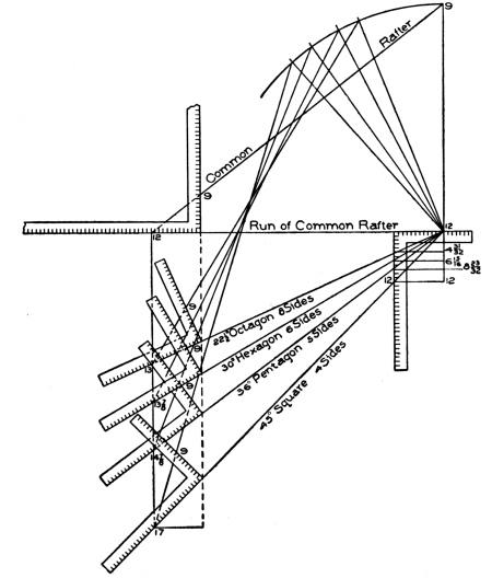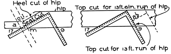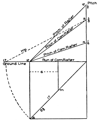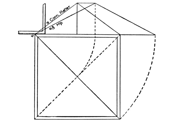| hips and rafters for roofs of various pitches over square corner, | ||