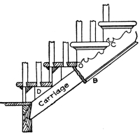An end portion of a cut and mitered string is shown in Fig. 9, with part of the string taken away, showing the carriage—a rough piece of lumber to which the finished string is nailed or otherwise fastened. At C is shown the return nosing, and the manner in which the work is finished. A rough bracket is sometimes nailed on the carriage, as shown at D, to support the tread. The balusters are shown dovetailed into the ends of the treads, and are either glued or nailed in place, or both. On the lower edge of string, at B, is a return bead or moulding. It will be noticed that the rough carriage is cut in snugly against the floor joist.