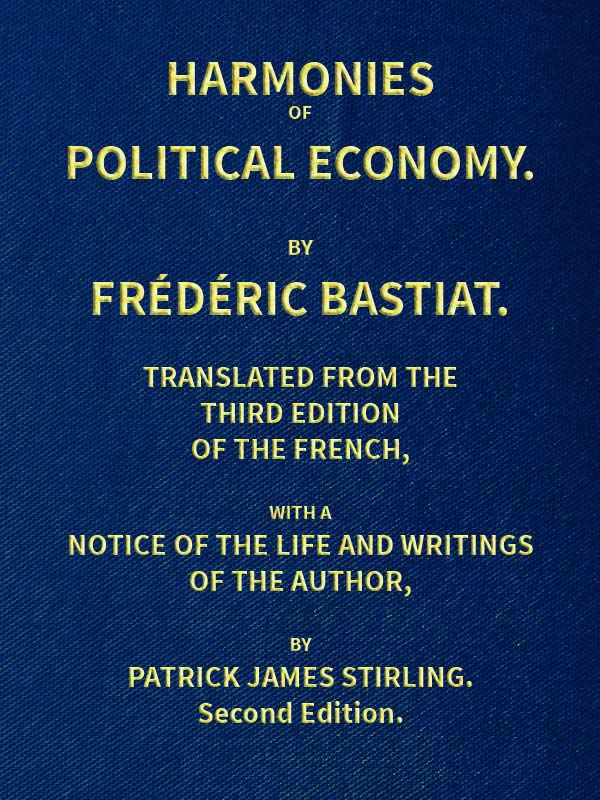 The favour with which the English public has received the First Edition of this translation of Bastiat’s Harmonies Économiques, published originally in separate parts, has induced me to have the whole reprinted in a cheaper and more accessible form, in the hope of giving the work a wider circulation, and rendering it more generally useful.