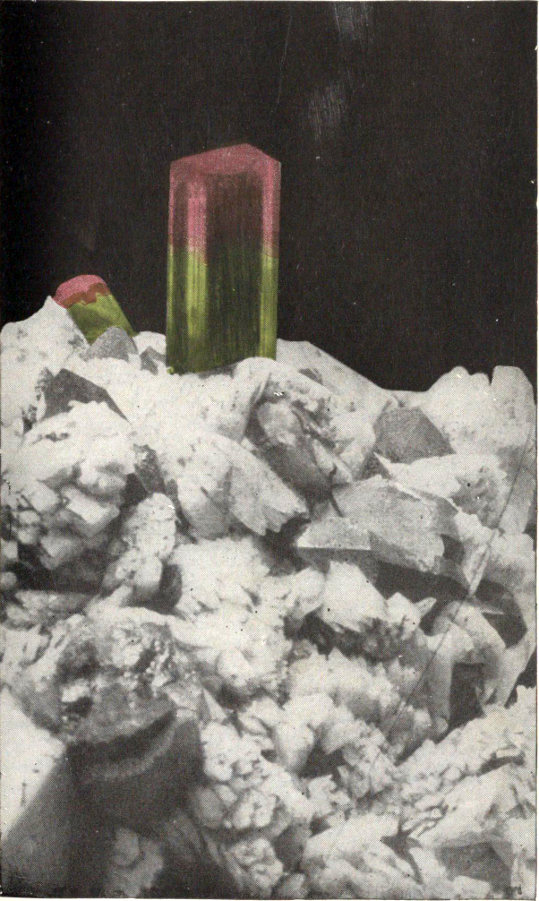 - Tourmaline crystals, growing amid feldspar crystals in a cavity in granite, from Paris, Me. 279