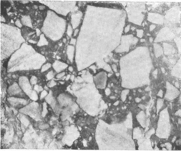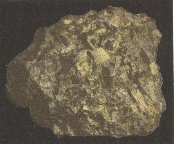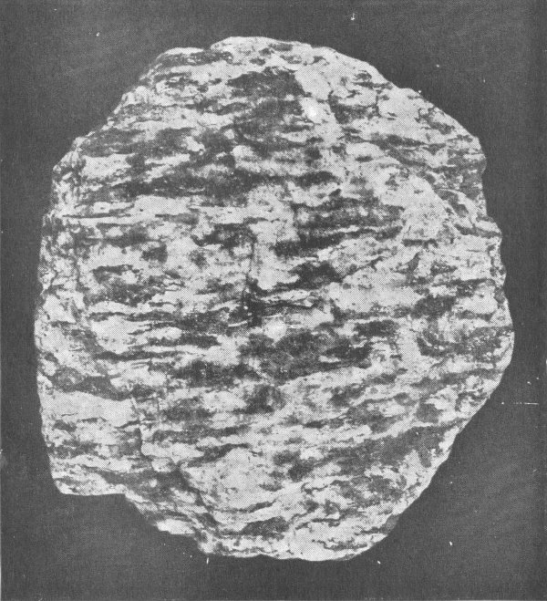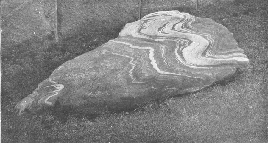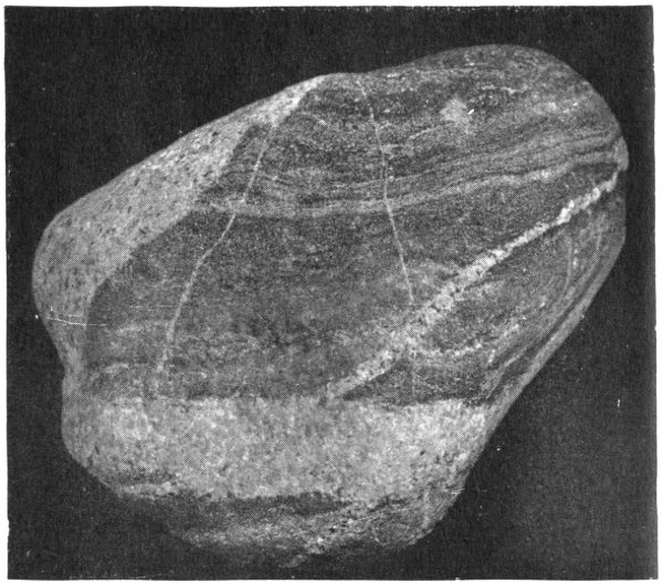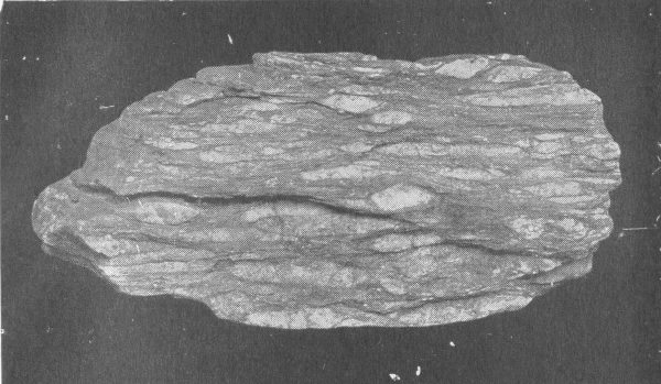 A conglomerate partly metamorphosed to a gneiss. Note the flattened pebbles and the alternation of the intermediate material to mica scales, etc.
