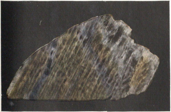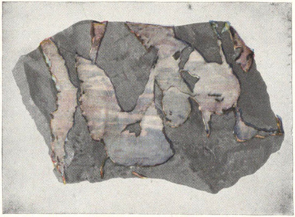 - Plate 35.—A group of microcline crystals from Pike’s Peak, Colo. Labradorite, showing multiple twinning (the striation) and the iridescent play of colors (in color) 299