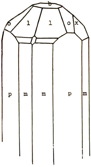 - Plate 49.—Apatite crystals in crystalline calcite. The ends of apatite crystals showing common modes of termination (in color) 306