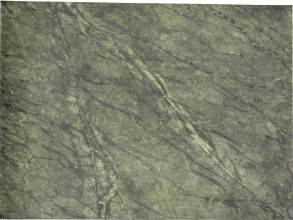A white marble, with black streaks due to graphite