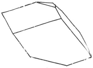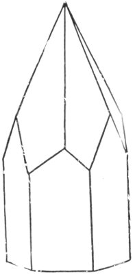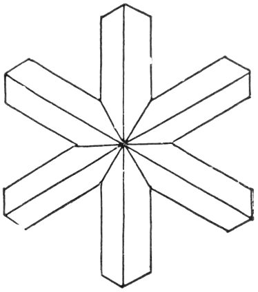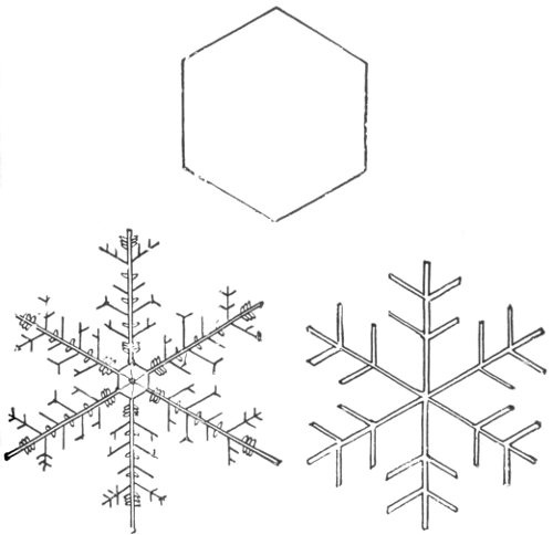 Ice crystals, the top one, the end of a hexagonal prism; the two lower figures multiple twins as in snow flakes
