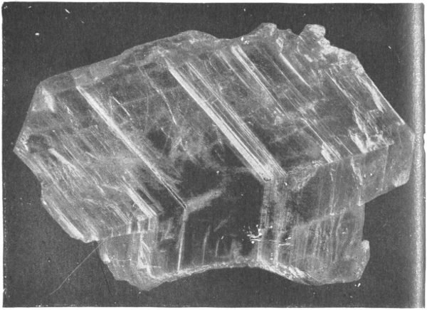 - Plate 47.—A piece of gypsum looking on the surface of the perfect cleavage, and showing the two other cleavages as lines, intersecting at 66°. Twinning is also shown. A simple crystal of gypsum. Twin crystals of gypsum. 332