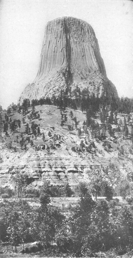 The Devil’s Tower, Wyoming, an example of igneous rock with columnar structure, and resting on sedimentary rocks. Courtesy of the U. S. Geological Survey