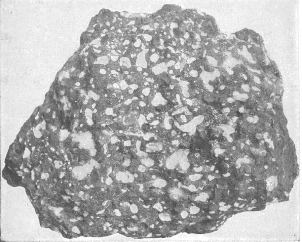 Basalt-porphyry. The large white crystals are phenocrysts of plagioclase feldspar