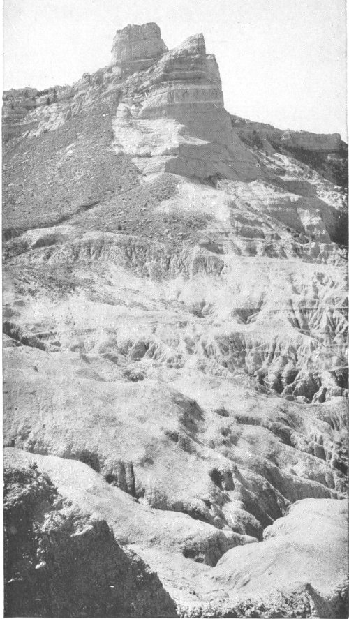 The north face of Scott’s Bluff, Neb., showing sedimentary sandstones above and clays below. The type of erosion is characteristic of arid regions. Courtesy of the U. S. Geological Survey