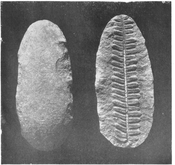 A line concretion, which on splitting disclosed a fern leaf of the age of the coal measures
