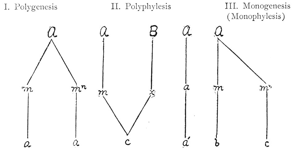 37. When this word was first proposed, the author did not know that Briquet had already applied the term polytopism to this concept (Ann. Conserv. Bot. Gen., 5:73. 1901). Since polygenesis expresses the idea of origin, and applies to multiple origin in time as well as in space, it is retained as the name of this concept. Polytopic and monotopic are adopted for multiple and single origin in space respectively, and polychronic and monochronic are proposed for similar origin in time.