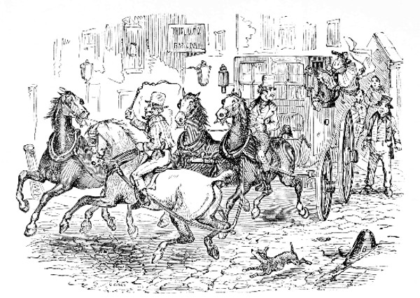 "Phiz" may now be said to have fairly commenced his career as a book-illustrator. His sense of humour corresponded so exactly with that of Dickens, that a mere suggestion enabled him to vividly represent the scenes described by the author. It has been remarked (and truly) that in many cases the plates do not correspond with the text; but this can be accounted for. Dickens, then an enthusiastic young author, and somewhat impetuous in his demands for drawings, would arrive unexpectedly at Browne's studio, hurriedly read a few pages of manuscript, and exclaiming, "Now, I want you to illustrate that," would take an abrupt departure, carrying the manuscript off with him. As soon as the artist could collect his faculties, he would try to recall the scene so hastily described, and endeavour to put it on paper. Dickens himself, in his preface to the Pickwick Papers, gives a similar explanation, viz.—"It is due to the gentleman, whose designs accompany the letterpress, to state that the interval has been so short between the production of each number in manuscript and its appearance in print, that the greater portion of the illustrations have been executed by the artist from the author's verbal description of what he intended to write." It is therefore not surprising that a few errors, in such details as the number of boys in a procession,[C] or the dress of an individual, should occur.