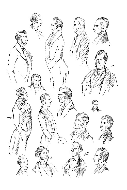 Artists frequently experience great difficulty in realizing, to the author's satisfaction, the description of scenes and characters. An illustration is here given showing Browne's various "fancies for Mr. Dombey," all of which failed to please Dickens, who also expressed his disapprobation of this artist's treatment of another subject in Dombey and Son. "I am really distressed," writes he, "by the illustration of Mrs. Pipchin and Paul. It is so frightfully and wildly wide of the mark. Good Heaven! in the commonest and most literal construction of the text, it is all wrong. She is described as an old lady, and Paul's 'miniature arm-chair' is mentioned more than once. He ought to be sitting in a little arm-chair down in the corner of the fire-place, staring up at her. I can't say what pain and vexation it is to be so utterly misrepresented. I would cheerfully have given a hundred pounds to have kept this illustration out of the book. He never could have got that idea of Mrs. Pipchin if he had attended to the text. Indeed, I[Pg 12] think he does better without the text; for then the notion is made easy to him in short description, and he can't help taking it in."