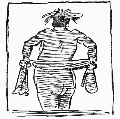 "I hāāve my W. C. White:[F]—but I have no white collars—and as I am swelling it about without a necktie—mine having mysteriously disappeared, left behind in a bath probably—perhaps it would be coming it too strong to appear without collars also, and it is hardly warm enough for it either. Your P.O. is from the Miscellany—to H. K. Browne—from Mr. Barrett—Xtian name unknown—and no matter. Any blocks that come, forward on. Send me a * * * * * * before I return. I did some very good shades myself—of myself—unconsciously—yesterday evening. The baths run along one side of the High Street, flush with the pavement—and I found when I had nearly finished my toilet that the gas-burner was so ingeniously placed, that it was impossible for any bather to avoid casting gigantic studies of the nude upon the window blind.—This sort of thing.—"