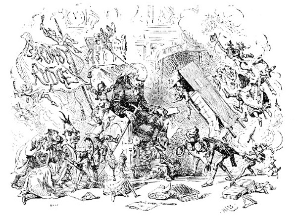 Tom Burke of Ours (1844) contains forty-four illustrations by "Phiz," many of which represent the scenes connected with the battles of Austerlitz, &c., during the reign of the great Napoleon. Most especially noticeable is the scene in a court of justice, with "Darby in the Chair;" the face of that hero with an expression apparently abashed, but really full of roguishness, as he gazes at the counsel, is one of the most successful of Browne's efforts.