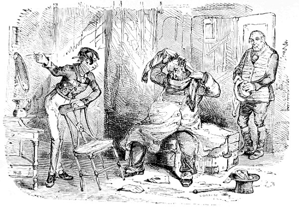 "Phiz," notwithstanding his crippled condition, still worked hard with admirable perseverance, though his difficulties were increased by an injury to his thumb, which compelled him to hold his pencil between the middle and fore fingers. His friends endeavoured to persuade him to draw his pictures on a larger scale, in order that they might be photographed to the required dimensions, but, with one or two exceptions, he refused to act on this suggestion. He gradually lost that facility which characterized his work, and latterly yielded to proposals to illustrate boys' literature of a rather low class.
