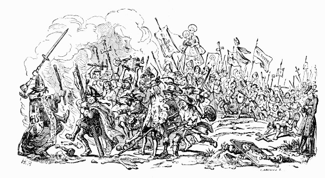 In Charles Lever's Harry Lorrequer (1839) and Charles O'Malley (1841), the uproarious mirth and jollity of Irish military life is well portrayed by the needle of the artist. "The last night in Trinity" in the latter work, is an example of this, wherein is seen the worthy Doctor perched on a table, surrounded by a batch of Irish dragoons, and being elevated by an explosion of combustibles. The horses in the illustrations are admirably drawn.