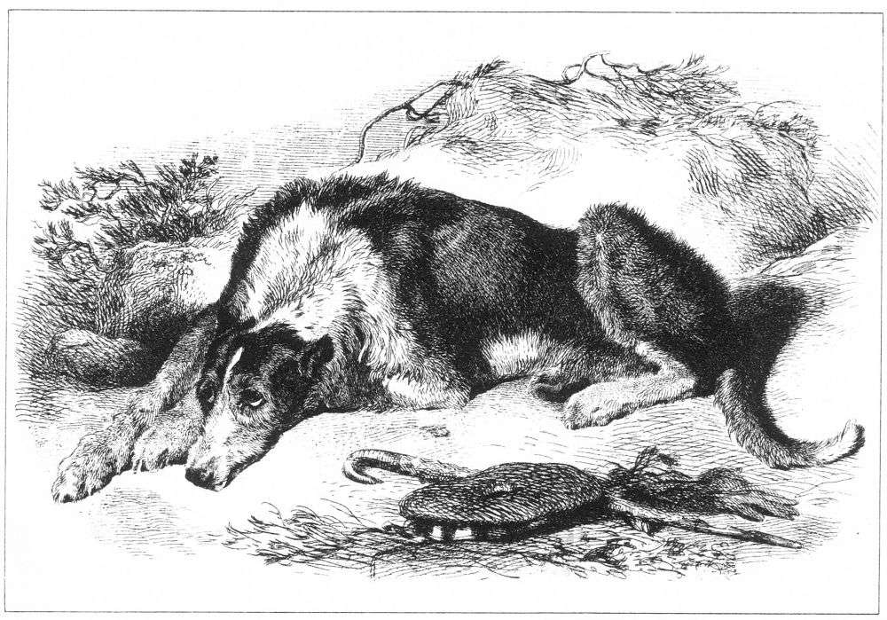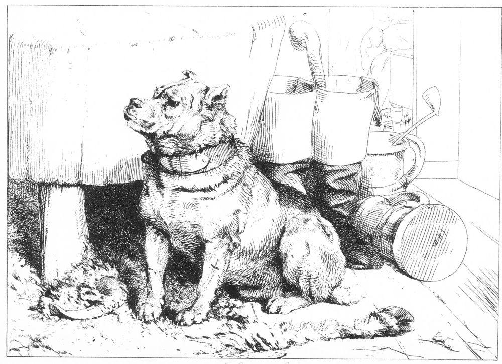 “Without giving any opinion as to ‘the minor works of the painter,’ when ‘he was little more than an infant,’ of which of course I know nothing, but I unhesitatingly claim a precedence of the dog before the Mule and Pointer of W. H. Simpson, Esq., in 1815, as well from the facts I will state as from the intercourse with Sir Edwin Landseer himself. ‘The dog’ was the property of my mother-in-law, who resided here, and who received it in 1814 from a Swiss gentleman who had obtained ‘Lion’ and another direct from the Monastery of St. Bernard. You will perceive that Thomas Landseer records, in his etching ‘from the drawing by his brother Edwin, that he did it, aged thirteen;’ as he was born in 1802, consequently, the etching was made in 1815. Now, Sir Edwin himself told me that it was his first work, and of course could not forget any of the circumstances; ‘that he met the dog in London streets under the care of a man servant, whom he followed to Mrs. L. W. Borde’s residence, who permitted him to make a sketch of it.’ Your remark that the drawing was done by Sir Edwin when he was nineteen years of age, and in the year 1821, is clearly a mistake, for ‘Lion’ was never in London since 1815, and died in 1821. There were several litters of puppies in that interval, one of which, a brindled dog that was named ‘Cæsar,’ is with ‘Lion’ in the picture of ‘Travellers in the Snow,’ and I myself sold this one at Tattersall’s, where he fetched thirty-five guineas at open sale, but I never heard who bought him. The breed is now quite extinct.