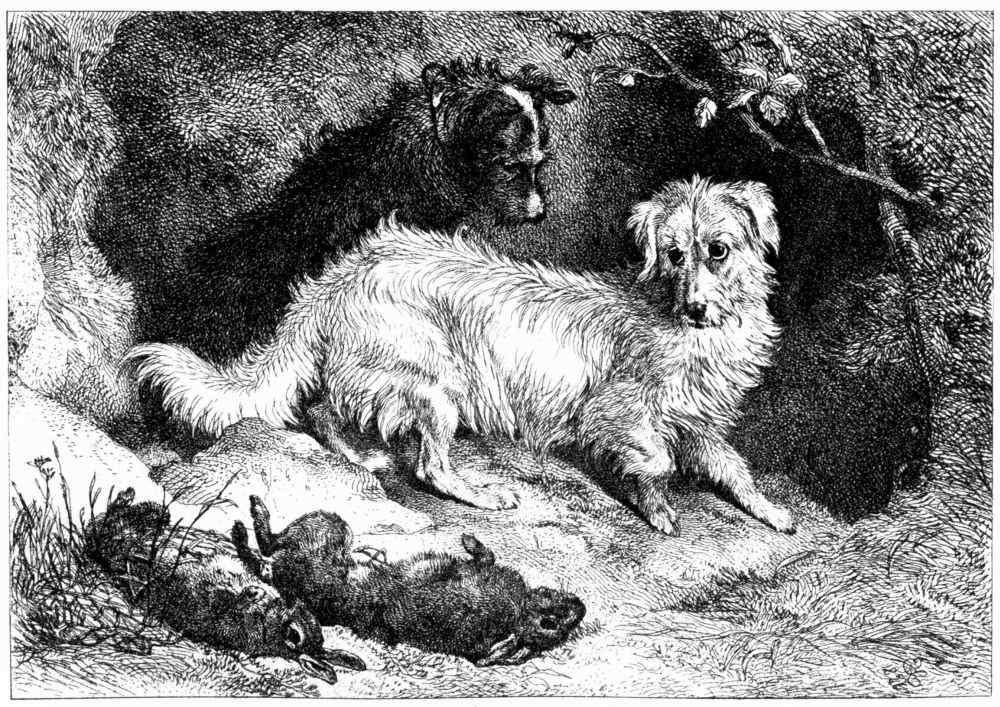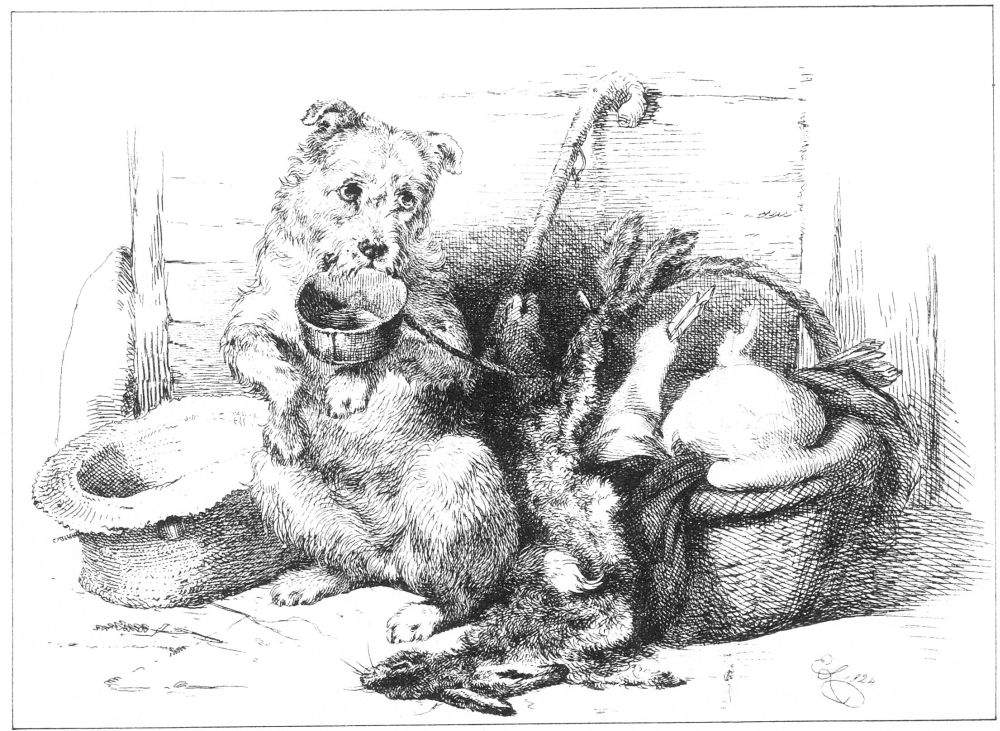 [38] It has been said that many years ago the Queen and her Consort made etchings after Landseer’s designs, especially from parts of “Bolton Abbey.” Her Majesty and her Consort made at least a dozen etchings from other works of Landseer’s. (See Mr. Algernon Graves’s Catalogue, p. 41.) Speaking of copies of engravings from pictures by our artist, it may be mentioned that many of foreign origin, including a large proportion of piracies, have appeared; among these are, repeatedly, “Bolton Abbey;” “Favourites” (1835), ponies belonging to the Duke of Cambridge; “Dogs of the Great St. Bernard;” “Dignity and Impudence;” “The Return from Hawking;” “Laying down the Law;” “The Lion Dog of Malta;” “A distinguished Member of the Humane Society,” and “A Jack in Office.”
