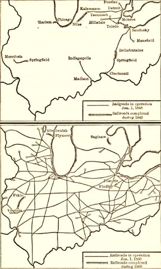 Communication by rail brought the most significant of the single changes into the Northern States. Before the panic of 1857 the trunk-line railways had completed their net of tracks between the Mississippi and tidewater. Nearly ten thousand miles had been built in the Old Northwest alone in the ten preceding years. But the effect of this on business, certain to come in any event, was not seen until secession closed the Mississippi to the agricultural exports of the Northwest. For a part of 1861 and 1862 traffic piled up along the young railroads extending from St. Louis and Chicago to Buffalo, Pittsburg, New York, and Philadelphia. But before 1863 these lines, notably the New York Central, the Erie, and the Pennsylvania, had adapted themselves to the trade which the South had thrust upon them; and never since secession has New Orleans regained her place as the great outlet of the Mississippi Valley.