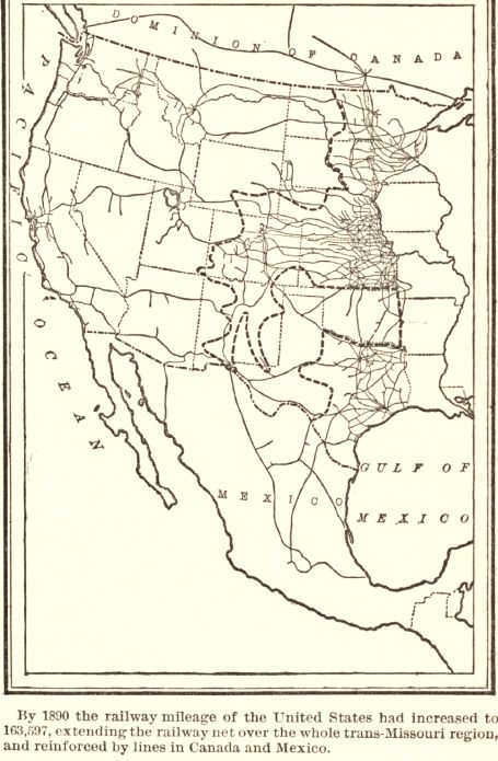 The activity of the North and the East between 1861 and 1865 was imitated and magnified among the youthful communities that made up the western border and ranged in age from a few weeks to thirty years. These had been mostly agricultural in 1857. Iowa, Minnesota, Wisconsin, and Kansas had been the frontier before the Civil War. In place of these, now grown to be populous and more or less sedate, a new group appeared farther west, within what had been believed to be the "American Desert." By 1868 Congress completed the subdivision of the last lands between the Missouri River and the Pacific, since which date only one new political division has appeared in the United States.