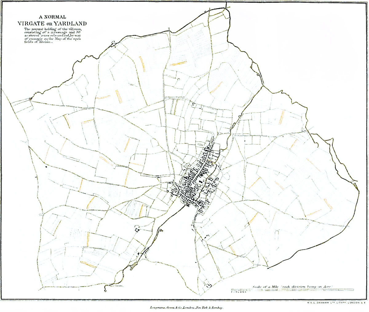 - Yard-land (gyrd-landes, virgata terræ), normal holding of villanus with two oxen in the common plough of eight oxen—a bundle of mostly thirty scattered strips in the open fields = German 'hub.' Example of yard-land in Winslow Manor rolls, 24. Rotation in the strips, 27. Large area in yard-lands, 28. Held in villenage by villani, 29. Evidence of Hundred Rolls, 33. Variation in acreage and connexion with 'hide,' 36, 55 = husband-land of two bovates in the North, 61, 67. Normal holding of villanus in Liber Niger of Peterborough, 73. Normal holding of villanus of Domesday Survey, 91–95. Large proportion of arable land of England held in yard-lands at date of survey, 101. Saxon 'gyrd-lands,' 111, 117. In 'Rectitudines,' 133. In 'Laws of Ine,' 142. A bundle of scattered strips resulting from co-operative ploughing, 117–125. With single succession (see 'Succession') which is the mark of serfdom of the holders, 176, 370