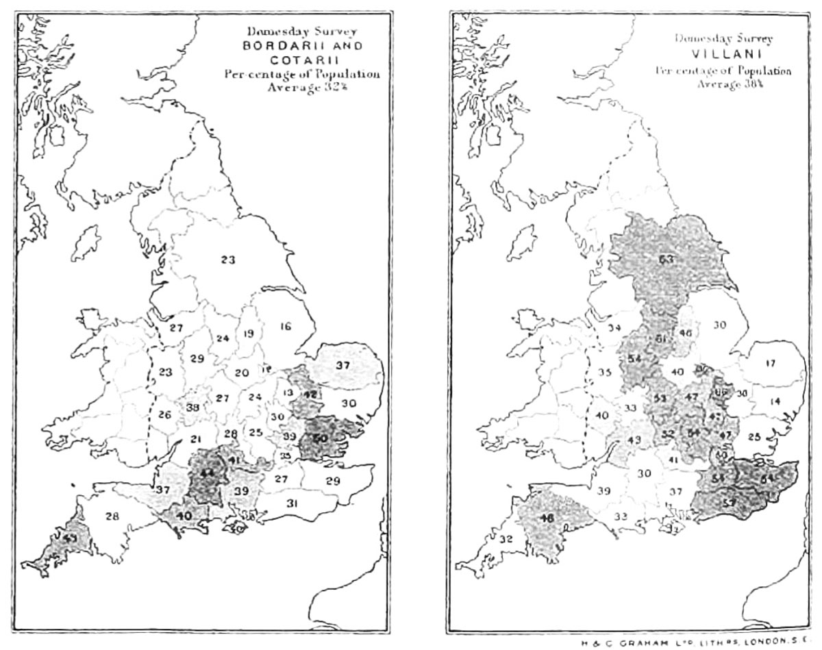 - Services of villani, chiefly of three kinds: (1) Gafol, (2) precariæ or boon-work, (3) week-work (refer to these heads), 41. In Hundred Rolls, 41. Domesday of St. Paul's, 53. Gloucester and Worcester records, 58. In Kelso records, 67. Boldon Book, 68. Liber Niger of Peterborough, 73. Summary of post-Domesday evidence, 78. On Saxon manors, in 'Rectitudines,' 130, 137–147. On Tidenham manor of King Edwy, 154. On Hysseburne manor of King Alfred, 162. In Saxon 'weork-ræden,' 158. Of cottiers (or bordarii) in Hundred Rolls, 44. Gloucester and Worcester, 58, 69. Of Saxon 'cotsetle,' 130, 141. On German and English manors compared, 399–405