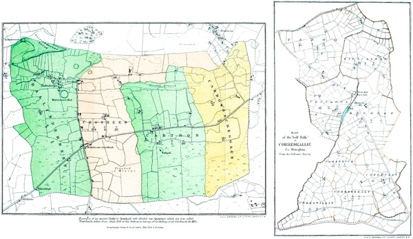 - Tribal System in Wales, 181–213. Welsh districts and traces of, in Domesday Survey, 182, 206–7. Food rents in D.S., 185. Welsh land system described by Giraldus Cambrensis, 186–189. In Ancient Laws of Wales, 189 et seq. The free tribesmen of Welsh blood, 190. Homesteads scattered about, but grouped into clusters for payment of food rents, 190. Their family land (tir-gwelyawg), 190–191. Their right to a tyddyn (homestead), five free 'erws' and co-tillage of waste, 192. The tribal household with equality within it among brothers, first cousins, and second cousins, 193. The gwely or family couch, 194. The gwestva, or food rent, and tunc pound in lieu of it, 195. Other obligations of tribesmen, 195. The taeogs or aillts (see these words) not tribesmen, their tenure and rules of equality, 197. Land divisions under Welsh Codes connected with the gwestva and food rents, 199–208. Early evidence of payment of gwestva and of food rents of taeogs, 208–213. Shifting of holdings under tribal system, 205. Cluster of twelve tyddyns in Gwent and sixteen in N. Wales pay tunc pound, 202, 203. In Ireland and Scotland, 214–231. Clusters of sixteen tates or taths (Welsh tyddyn), 215–217. Sir John Davies's surveys and description of tribal system, Tanistry, and Gavelkind, 215–220. Example of a Sept deported from Cumberland, 219. Ancient division of Bally or townland into quarters and tates, 221, 224. Quarters and names of tates still traceable on Ordnance Survey, 223–224. Names of tates not personal, owing to tribal distributions and shiftings of tribal households from tate to tate, 224. Irish open-field system—rundale or run-rig—226–228. Similar system in Scotland, 228–229. Tribal system in its earlier stages, 231–245. Tenacity with which tribal division among sons maintained, 234. The tribal house, 239. Blood money, 242. Wide prevalence of tribal system, 244. Absent from S.E. or Belgic districts of England at Roman conquest, 245. In Germany, description of tribal system by Cæsar, 336–337. Description of, by Tacitus, 338–342. Husbandry like Welsh co-tillage of the waste for one year only, 343–345. Manorial tendencies of German system: tribesmen have their servi who are 'like coloni,' 345–346. The manor in embryo, 346. Tribal households of German settlers—local names ending in 'ing'—whether clan settlements or perhaps as manorial as others, 346–367
