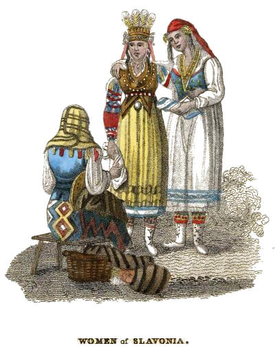 In Upper Croatia, in the county of Warasdin, for example, the dress of the women considerably resembles the above, but is more elegant. On the head is placed a large square of white linen, forming a roll in front, one fold falling over the back and two lying on the shoulders. The margins are adorned with borders of coarse lace two or three inches deep. The vest is of woollen cloth, fitted to the body, without sleeves, and descending below the knees, where it is trimmed with a few coloured stripes, generally red and bordered by fringe or lace. The white shift-sleeves hang large and loose, and are likewise ornamented with coarse lace. The vest is of two kinds, either opening on the sides or before, so as to display the laced front of a bodice held together by clasps, formed of bunches of coloured glass beads. Below the vest about two inches of a white petticoat appear, and below this another petticoat neatly plaited; and beneath all, boots either of black or yellow leather. They likewise wear coarse linen shawls folded round their shoulders and arms.