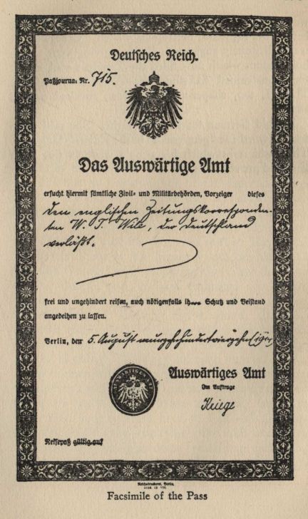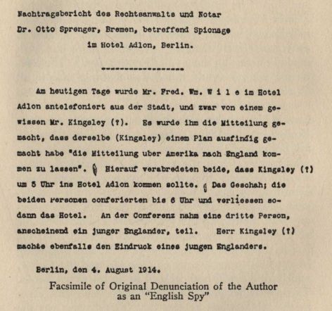 For thirteen years to the week--I have always had a respectful horror of thirteen--I was a resident of Berlin. During the first five years of that period my identity was clear: I was the representative in Germany of an American newspaper, the Chicago Daily News. But in 1906 I became an international complication, for it was then I joined the staff of the London Daily Mail, which converted my status into that of an American serving British journalistic interests in Germany. It was not long afterward that welcome opportunity presented itself to renew home professional ties in connection with my British work, and for several years prior to the outbreak of the war I carried the credentials of Berlin correspondent of the New York Times and the Chicago Tribune. They were on my person, with my United States passport, the night of August 4, 1914, when the Kaiser's police arrested me as an "English spy."