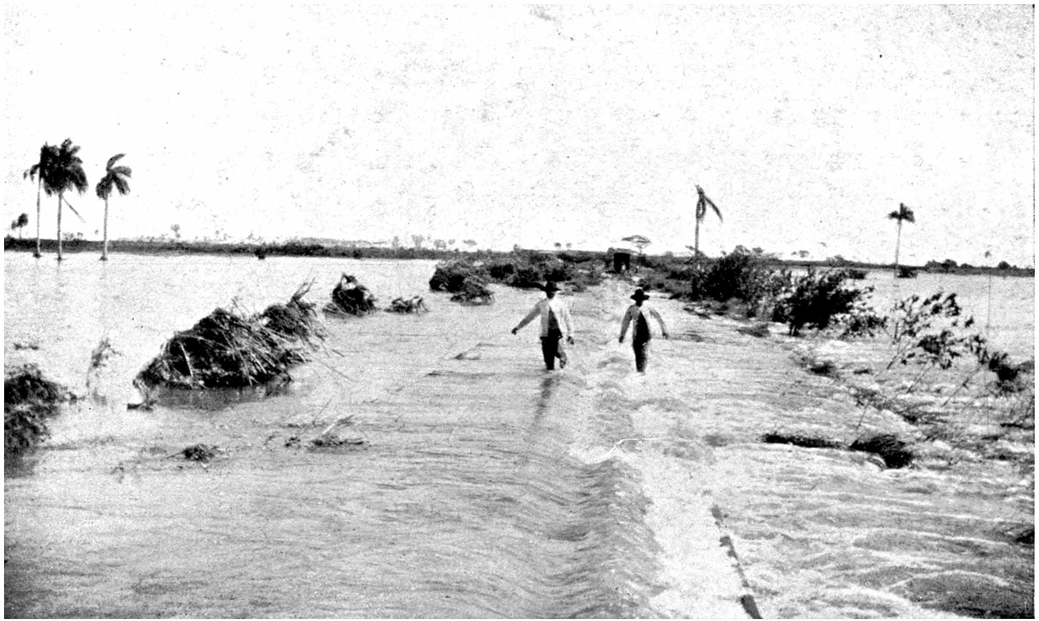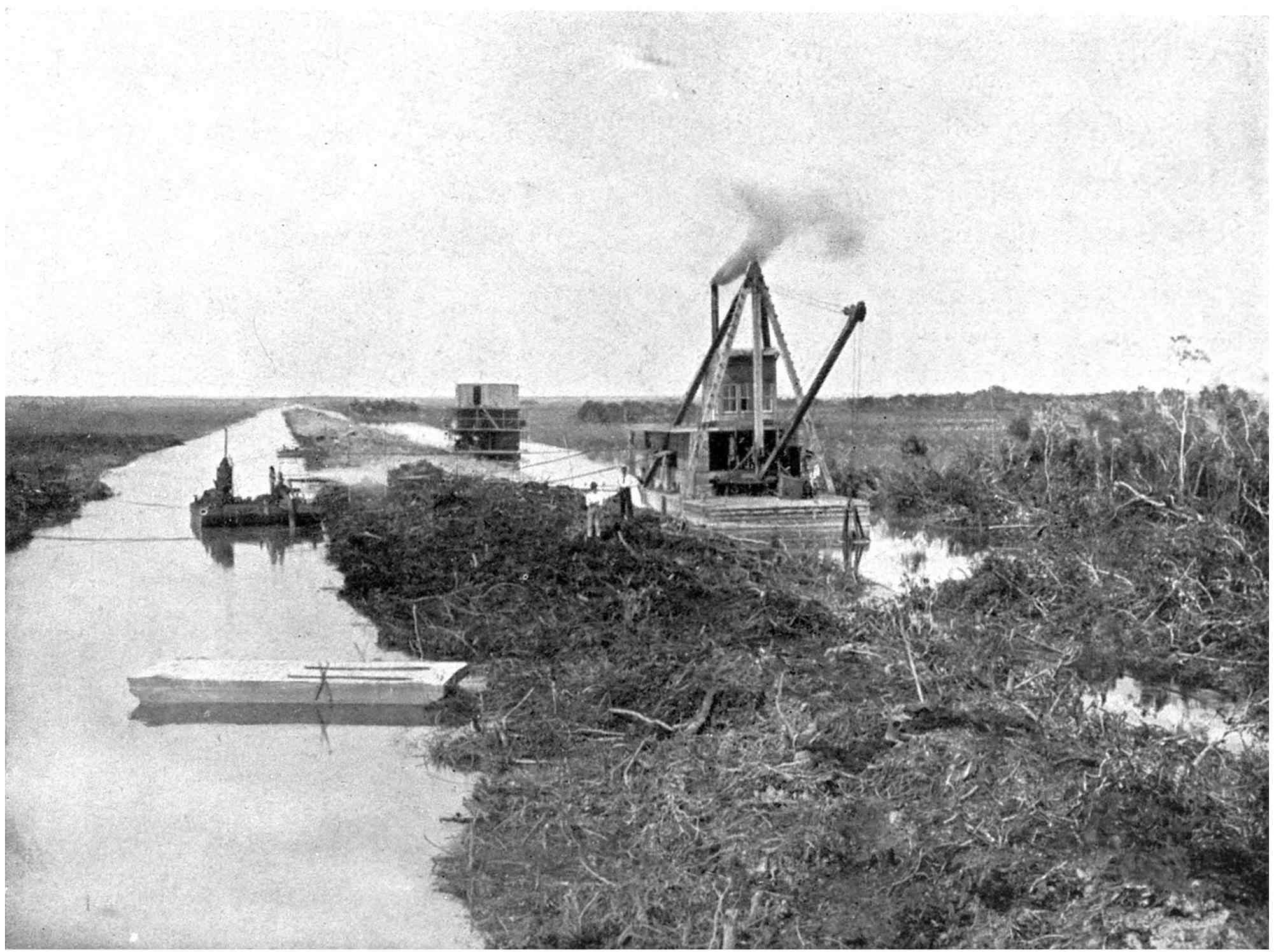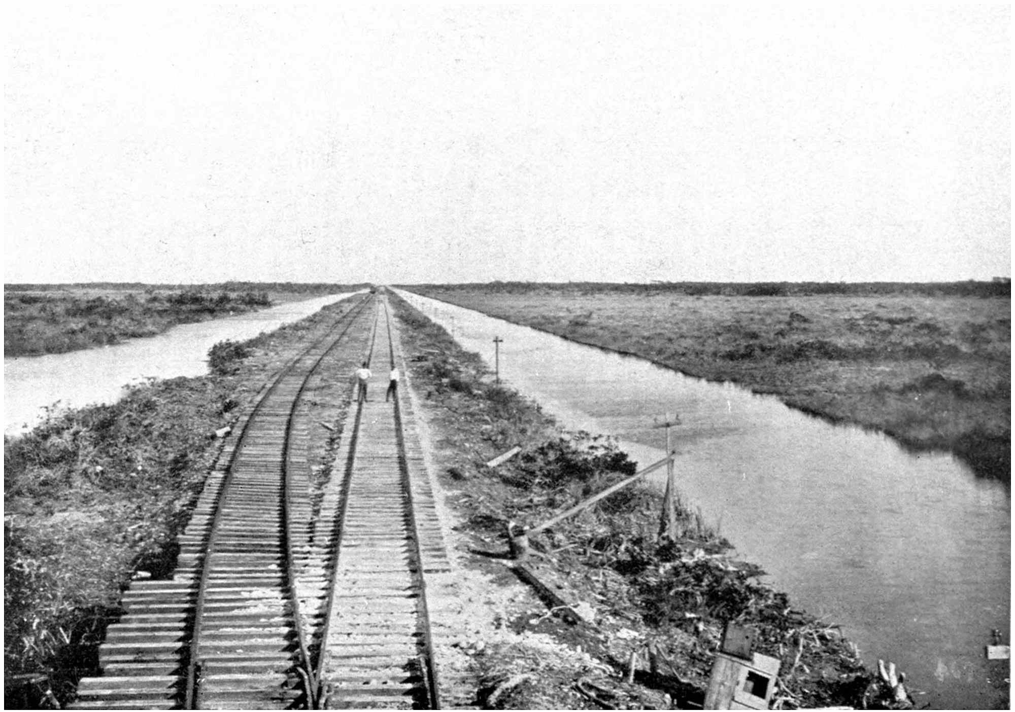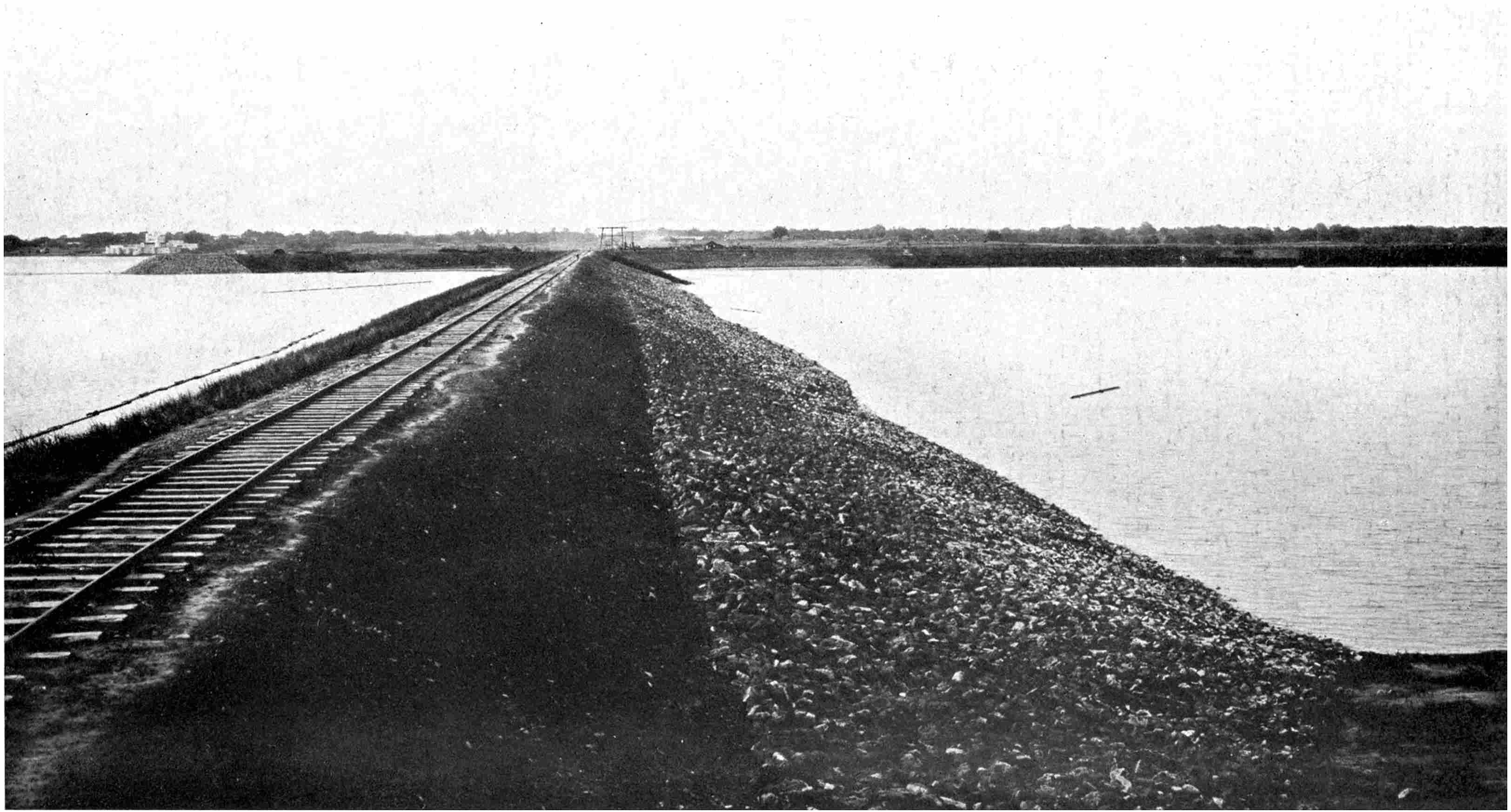 The “cut off” across the water is 27 miles in length, of which 15 miles are represented by solid earth embankment.