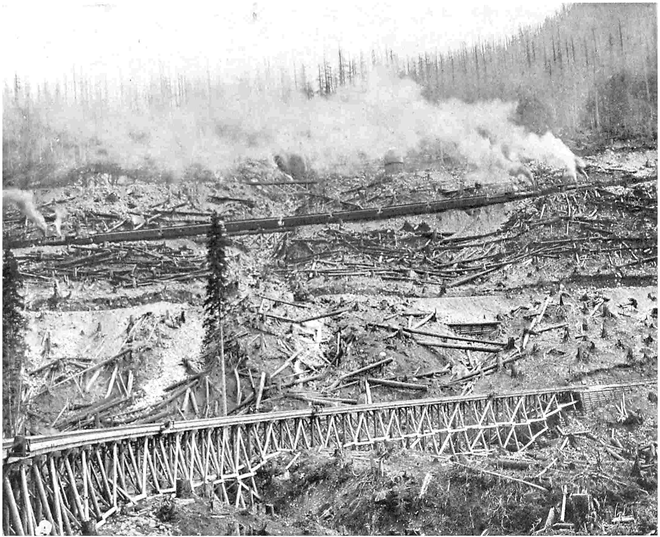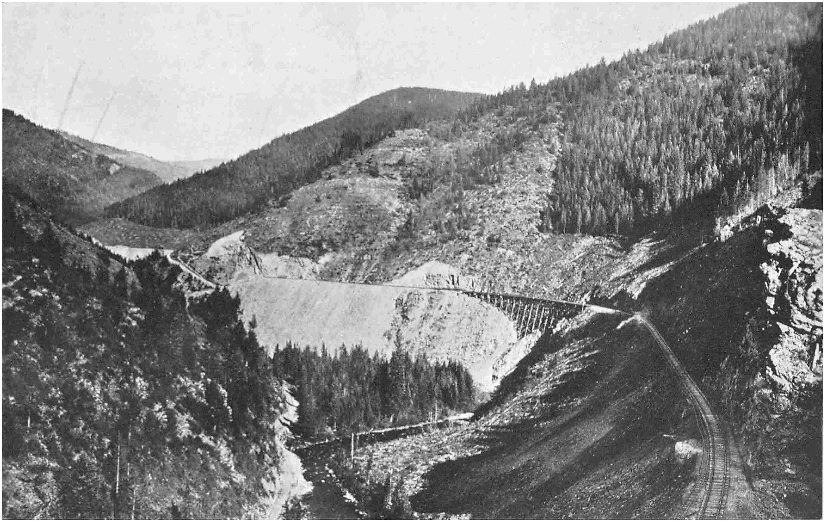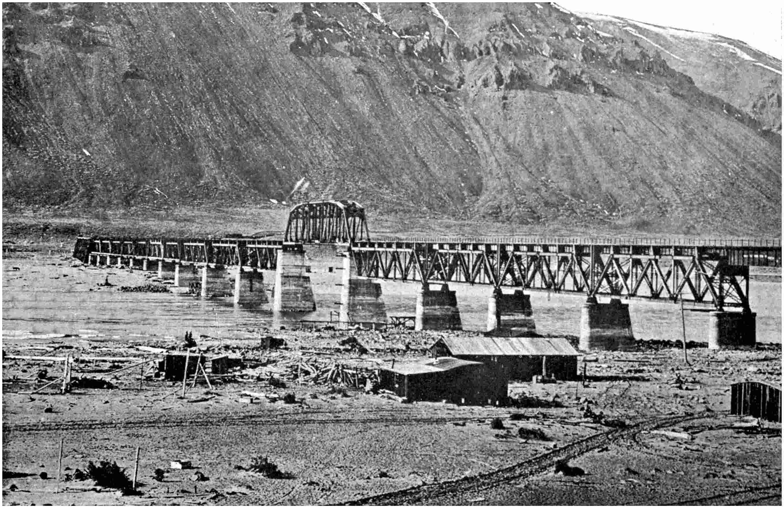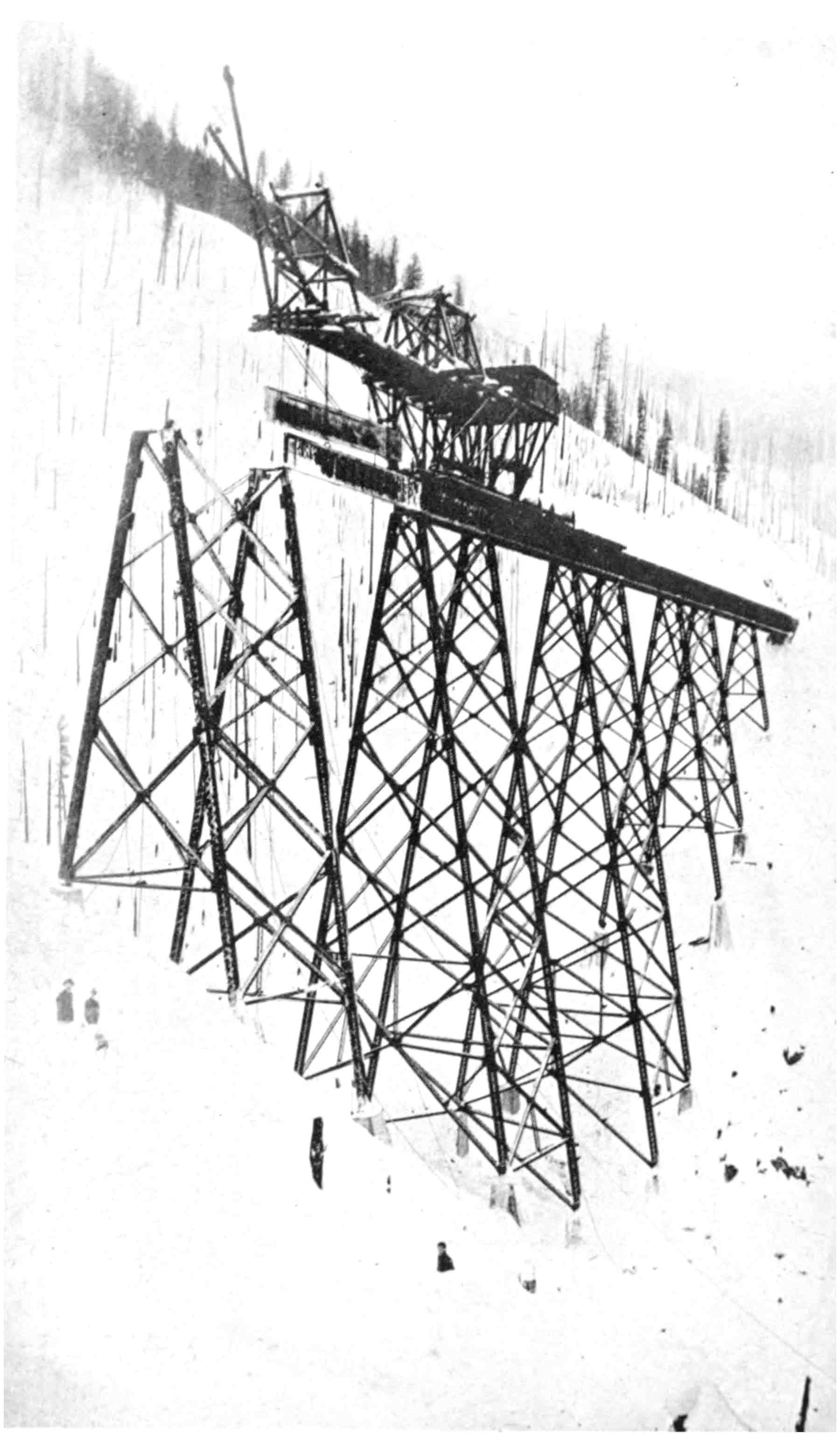 | The wonderful horseshoe timber trestle, 1,240 feet long, varying from 40 to 90 feet high, on the Central Alaskan Railway | 112 |
