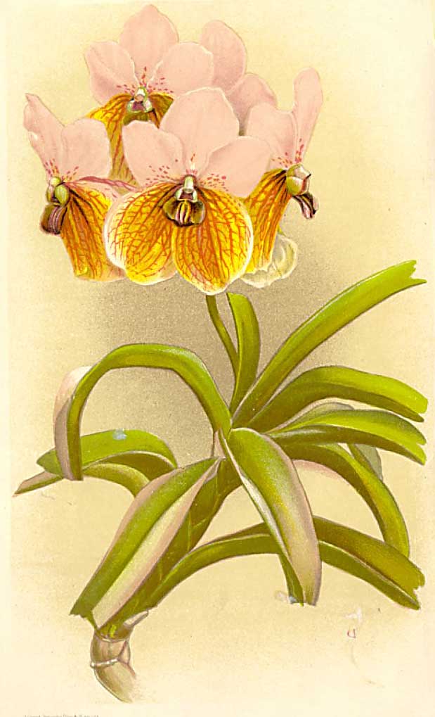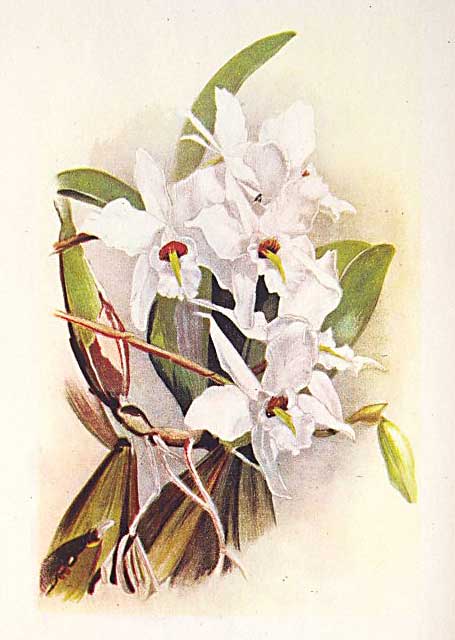 Other great sales might be recalled, as that of Phalœnopsis Sanderiana and Vanda Sanderiana, when a sum as yet unparalleled was taken in the room; Cypripedium Spicerianum, Cyp. Curtisii, Lœlia anceps alba. Rarely now are we thrilled by sensations like these. But 1891 brought two of the old-fashioned sort, the reappearance of Cattleya labiata autumnalis and the public sale of Dendrobium phalœnopsis Schroderianum. The former event deserves a special article, "The Lost Orchid;" but the latter also was most interesting. Messrs. Sander are the heroes of both. Dendrobium ph. Schroederianum was not quite a novelty. The authorities of Kew obtained two plants from an island in Australasia a good many years ago. They presented a piece to Mr. Lee of Leatherhead, and another to Baron Schroeder; when Mr. Lee's grand collection was dispersed, the Baron bought his plant also, for £35, and thus possessed the only specimens in private hands. His name was given to the species.