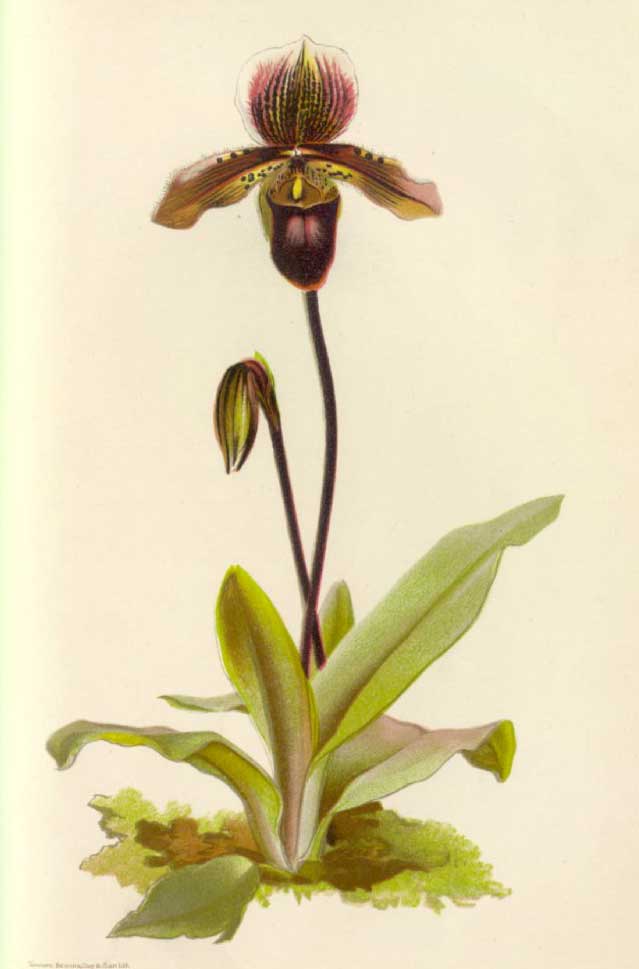 I mentioned the great sale of Cyp. Curtisi just now. An odd little story attaches to it. Mr. Curtis, now Director of the Botanic Gardens, Penang, sent this plant home from Sumatra when travelling for Messrs. Veitch, in 1882. The consignment was small, no more followed, and Cyp. Curtisi became a prize. Its habitat was unknown. Mr. Sander instructed his collector to look for it. Five years the search lasted—with many intermissions, of course, and many a success in discovering other fine things. But Mr. Ericksson despaired at last. In one of his expeditions to Sumatra he climbed a mountain—it has been observed before that one must not ask details of locality when collecting orchid legends. So well known is this mountain, however, that the Government, Dutch I presume, has built a shelter for travellers upon it. There Mr. Ericksson put up for the night. Several Europeans had inscribed their names upon the wall, with reflections [Pg 33]and sentiments, as is the wont of people who climb mountains. Among these, by the morning light, Mr. Ericksson perceived the sketch of a Cypripedium, as he lay upon his rugs. It represented a green flower, white tipped, veined and spotted with purple, purple of lip. "Curtisi, by Jove!" he cried, in his native Swedish, and jumped up. No doubt of it! Beneath the drawing ran: "C.C.'s contribution to the adornment of this house." Whipping out his pencil, Mr. Ericksson wrote: "Contribution accepted. Cypripedium collected!—C.E." But day by day he sought the plant in vain. His cases filled with other treasures. But for the hope that sketch conveyed, long since he would have left the spot. After all, Mr. Curtis might have chosen the flower by mere chance to decorate the wall. The natives did not know it. So orders were given to pack, and next day Mr. Ericksson would have withdrawn. On the very evening, however, one of his men brought in the flower. A curious story, if one think, but I am in a position to guarantee its truth.